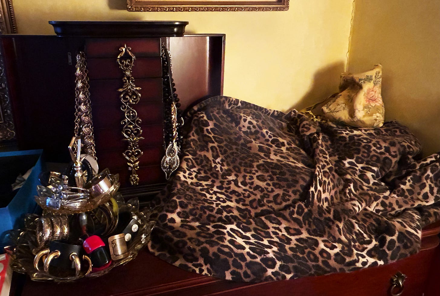 I have 4 hooks I hang (costume and semi-precious) necklaces from, a tiny box for REAL jewelry, a small mother-of-pearl dish, a 1950s ashtray with match holder (Fornasetti!) that also holds perfume samples, a crystal salt-cellar and a rose pink china dish. Whatever doesn't fit goes into a drawer and I forget it exists. Veronica has never been interested in any of it or it would all be under the sofa.