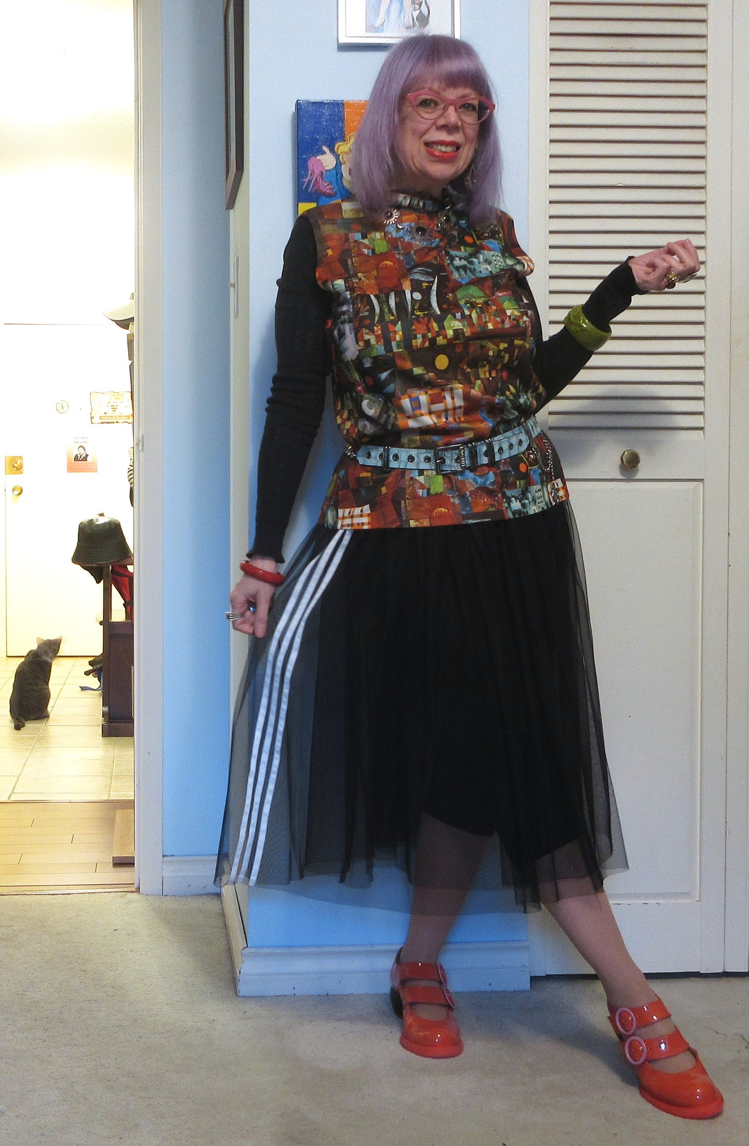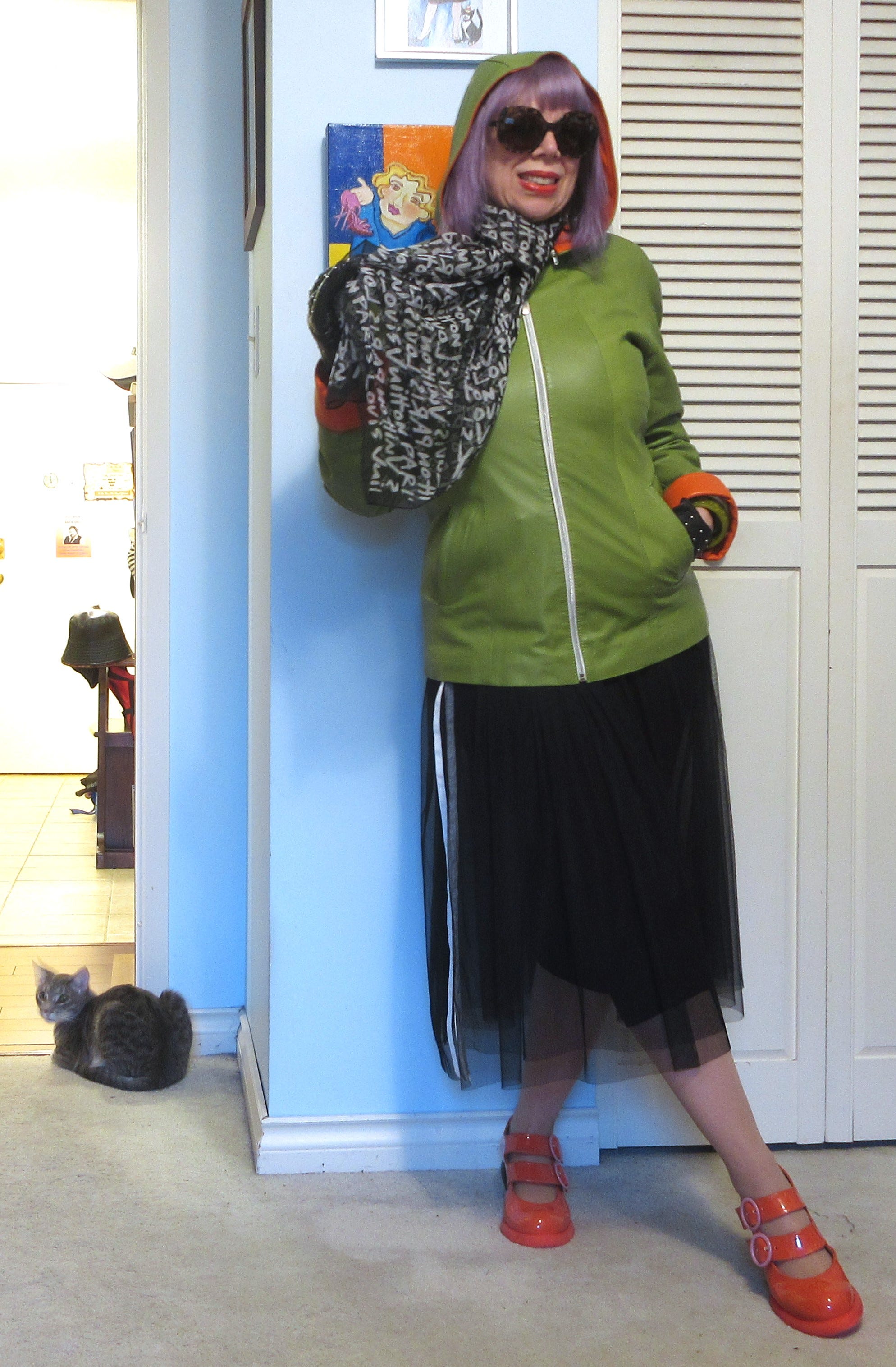 Branded items: Belt is by John Fluevog, as are the Groovy Aubrey orange shoes. Scarf is fake L. (stands for Lewis) Vuitton. Gloves from Danier Leather. Silver/blue topaz Fulvia Ring is by Wendy Brandes. The earrings are marked Brenda Schoenfeld 1992.