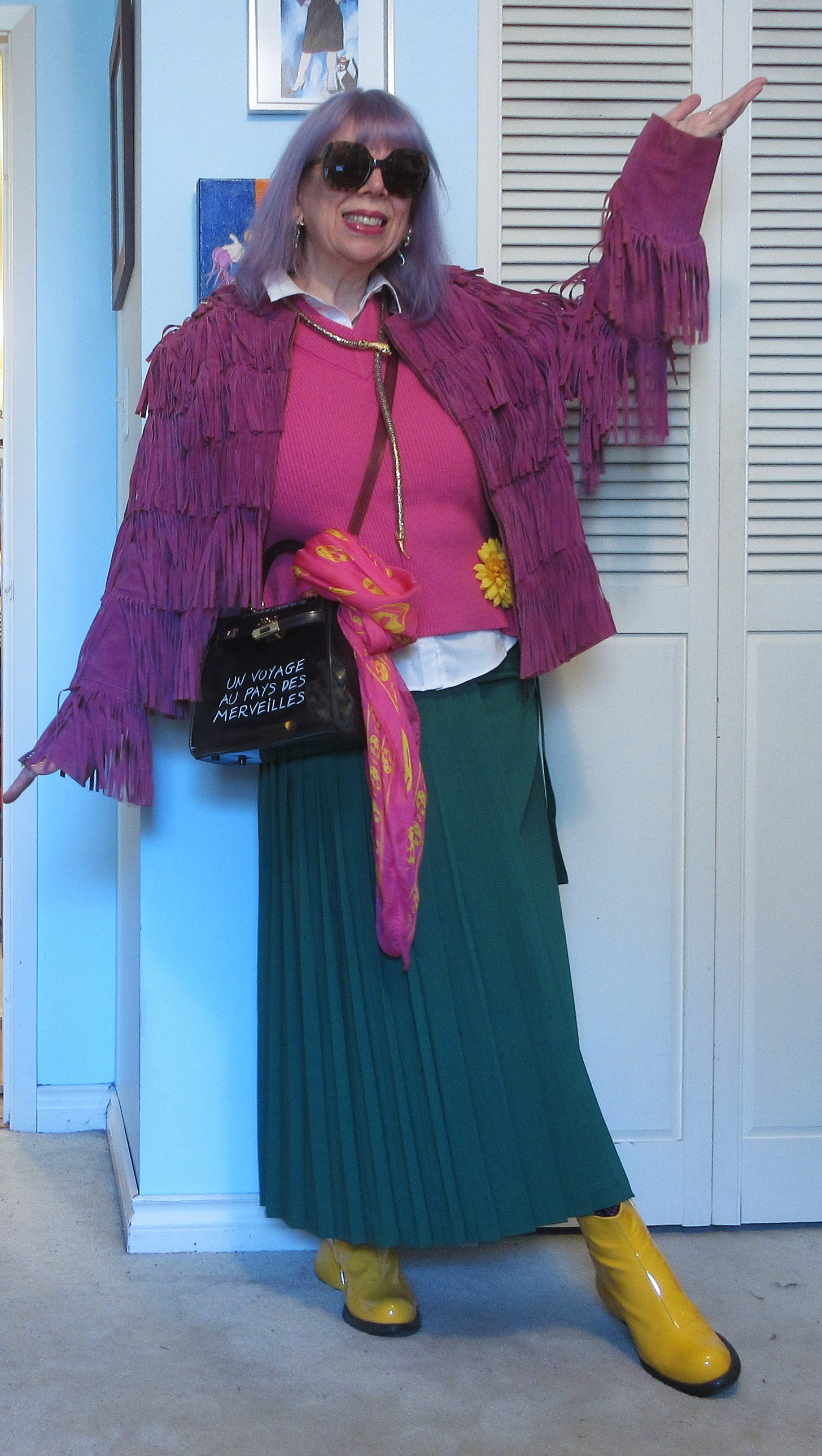 The pink and yellow scarf14 came next and then a coat that I ultimately rejected15 in favour of my fringed pink suede jacket. Working backwards, this pink sweater had been awaiting its seasonal wear and I was so pleased anew with it, I’ve moved it into the empty space left from letting go of some less “me” things.