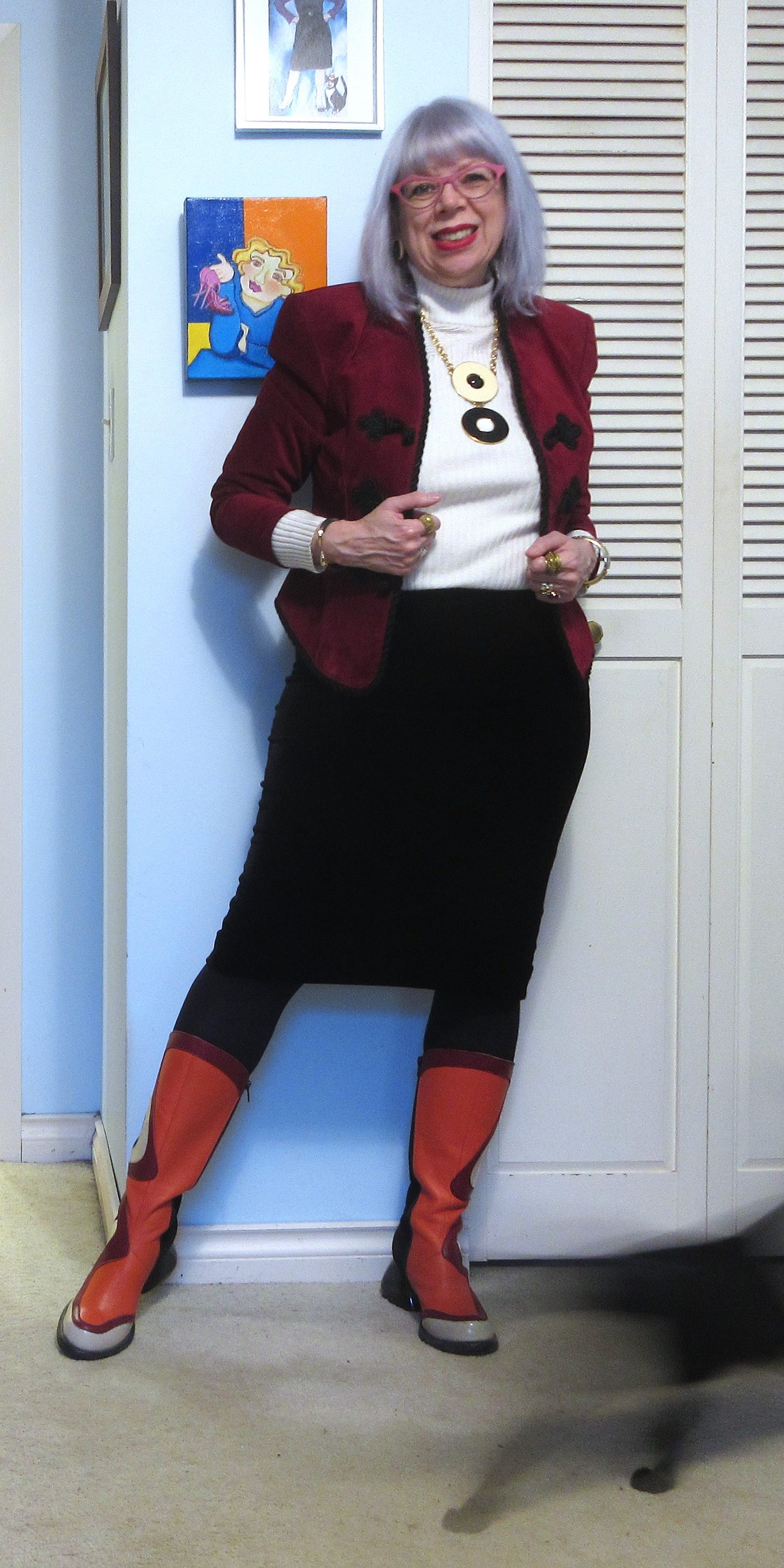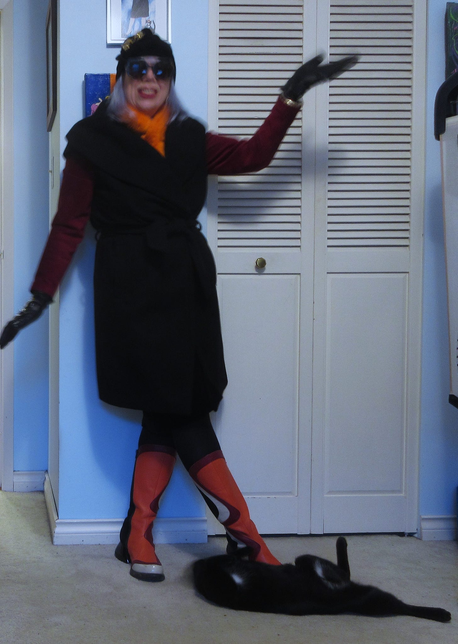 Branded items: Monet brooch. Roeckl gloves. F-Trip Warhol boots by John Fluevog. Cat is Wizard Whateley. Alexis Bittar “fang” Lucite bracelet. Monet necklace.