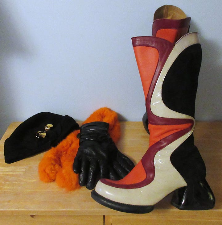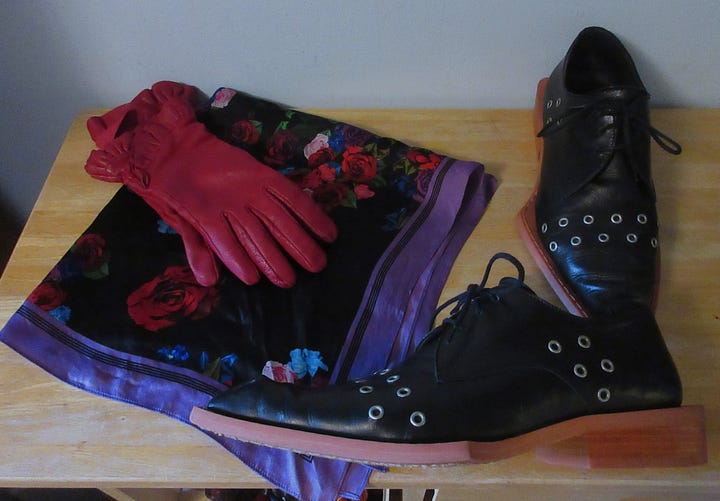Branded items: Parkhurst gloves. Sarah Coventry brooch8. Fluevog silk scarf. Wonders Ayers shoes, also by John Fluevog. D’Orlan fancy bracelet. Frances Jewelers gold/amethyst ring. Givenchy necklace.