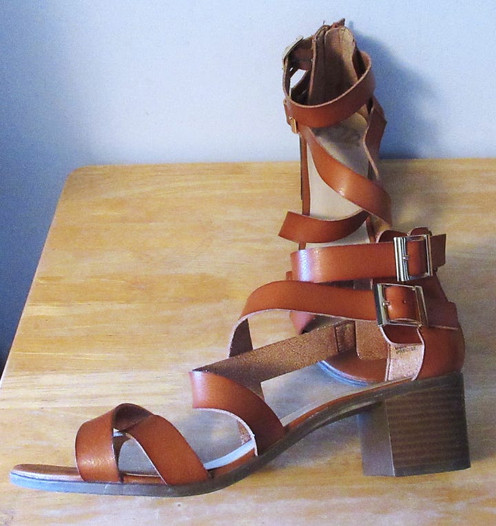 The sandals fooled me! I thought they were leather! Considering they are likely 15ish years old, they’re in excellent shape. They zip up the back of the heel, so you can just set the buckles/straps. Do you remember Fergie from Black-Eyed Peas’ footwear line? These were probably sold at The Bay department store.