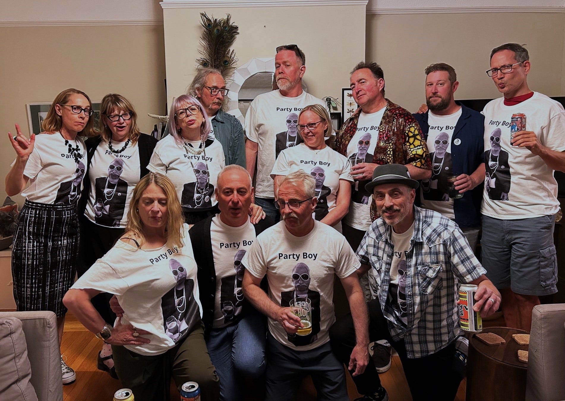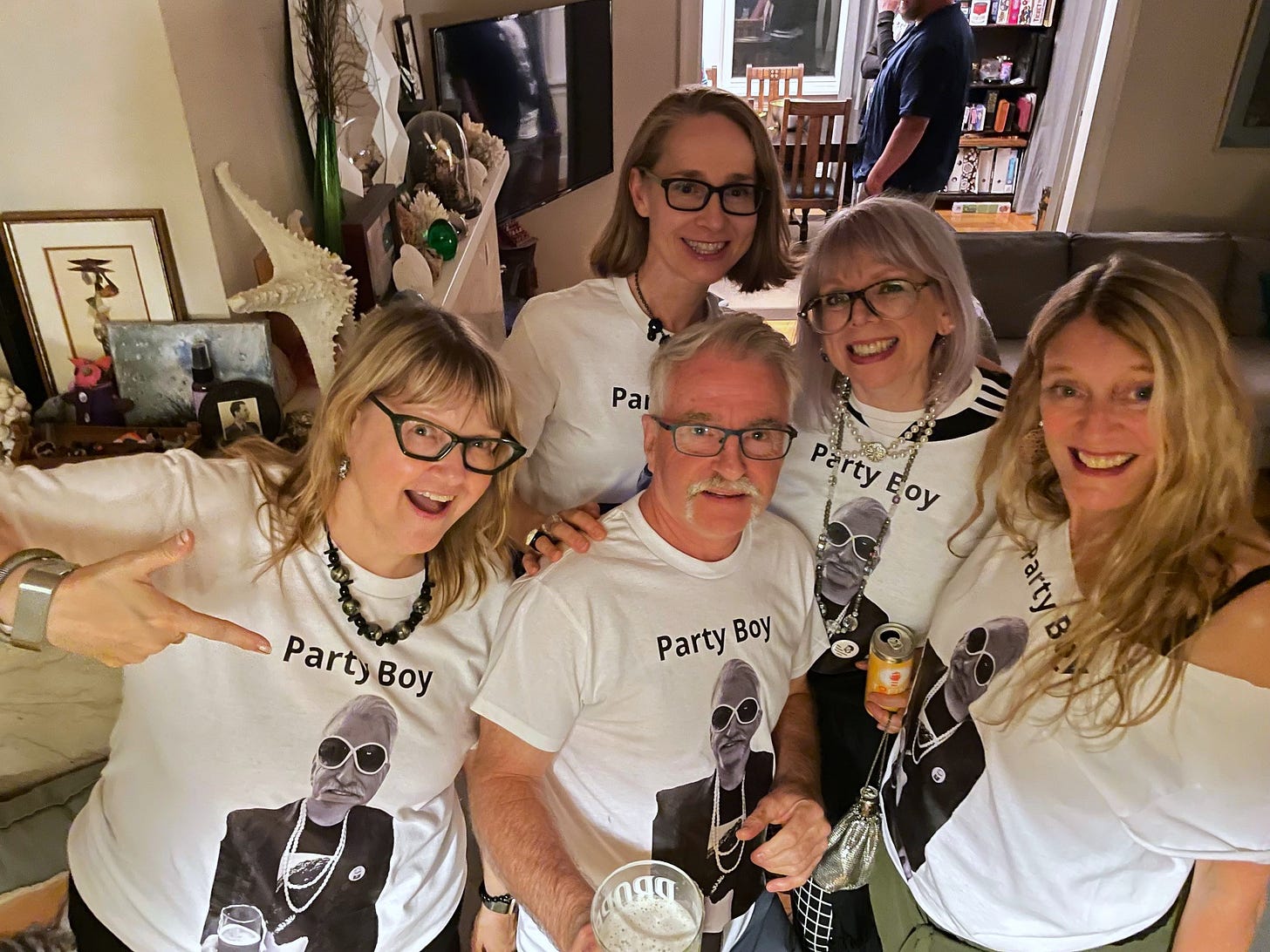 I could have napped - I wanted to! - but instead, I played around in my closet, putting an outfit together for dear pal Nick’s 65th birthday party that night. Awesome friend Casey took a hilarious pic of Nick from the Urbanite event in April and had it printed on t-shirts for over a dozen of us.