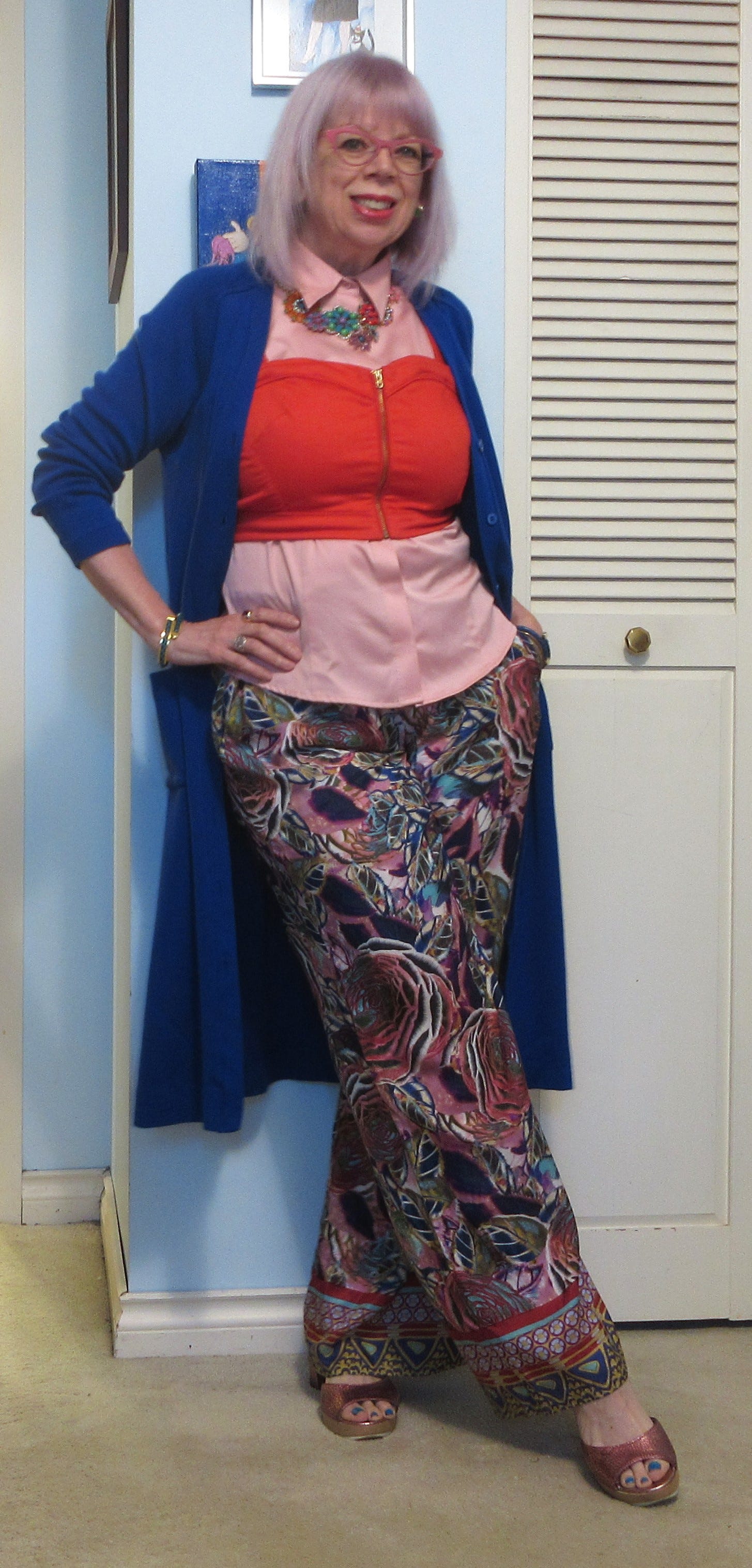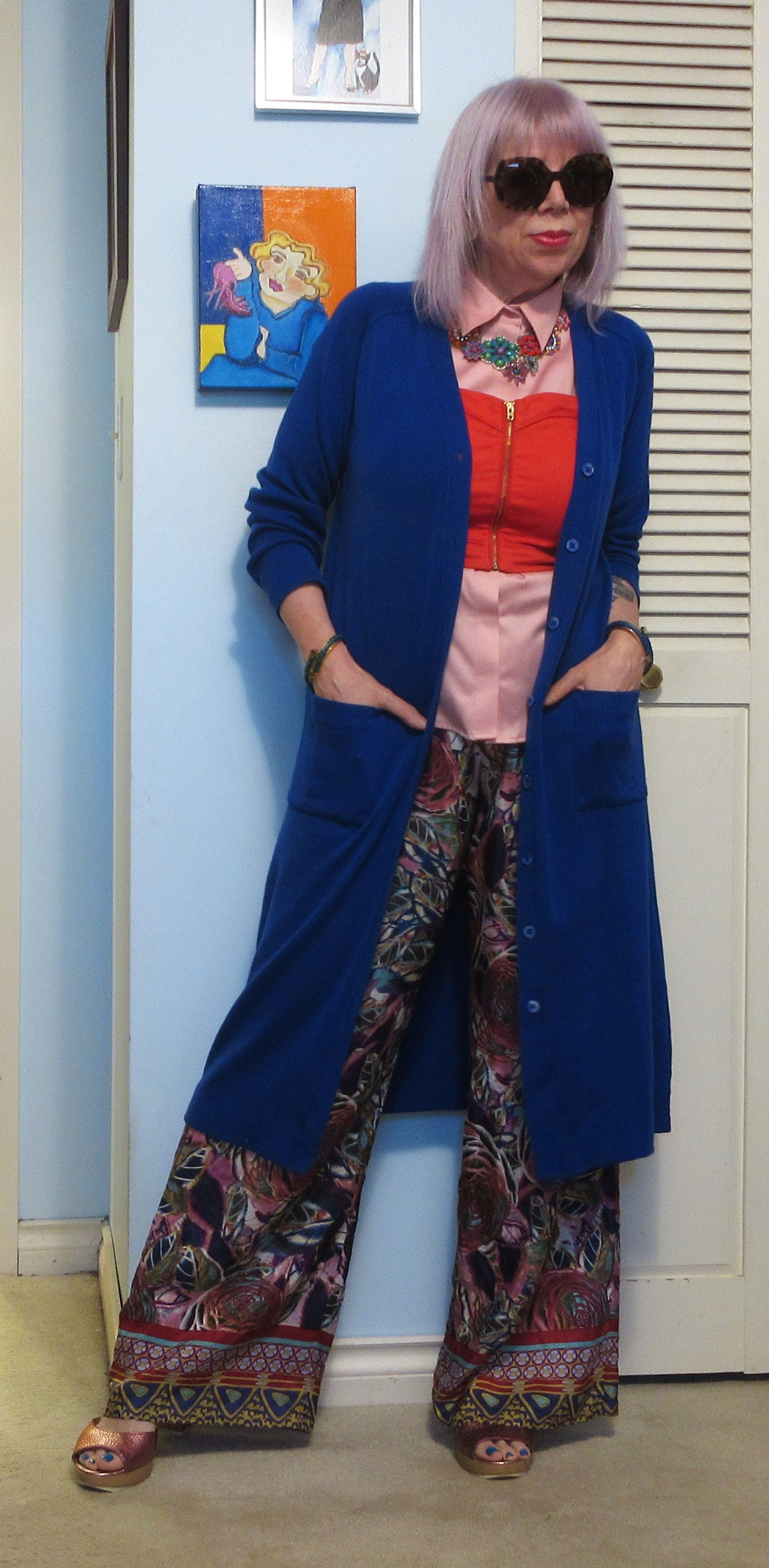 I’ve worn the shirt and the sandals together multiple times (matchy!), and the sumptuous wool 80s duster/cardigan/dress and the silk palazzos are old friends. Having these repeat formulae allows me to take shortcuts when styling something as tricky as the bustier.