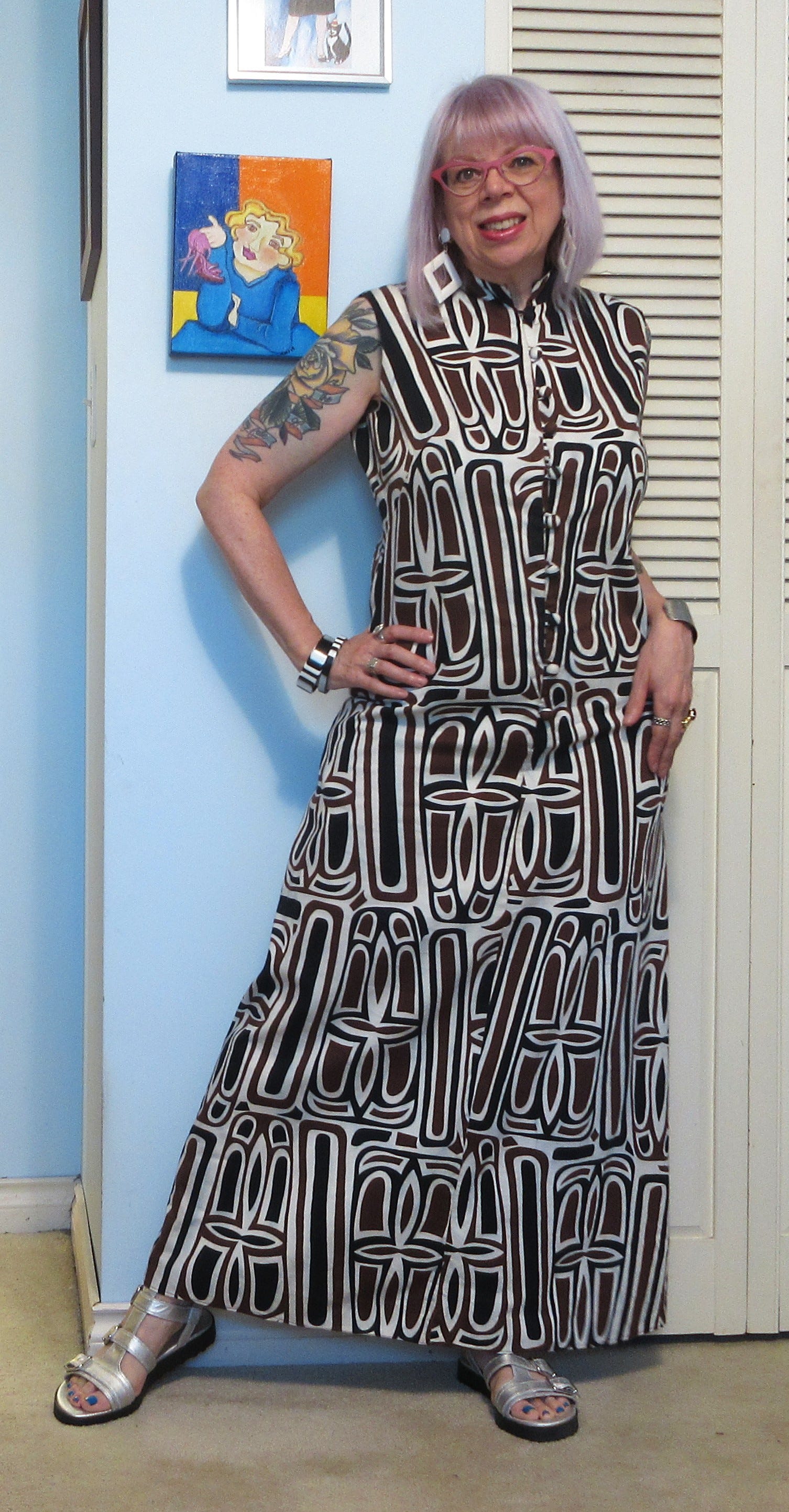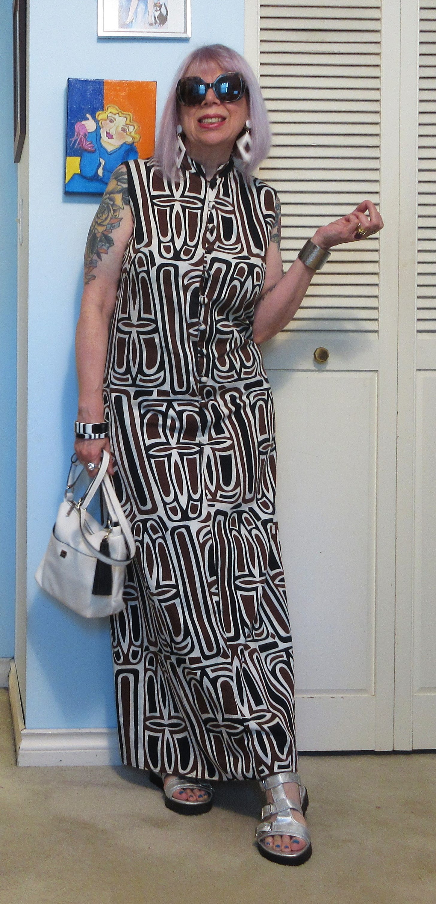 Another of my “one and done” vintage dresses that I pull out once a year for its annual wearing. I like that this maxi is an all-neutral pattern - it makes it much easier for styling, although I usually wear white and silver/steel with it.