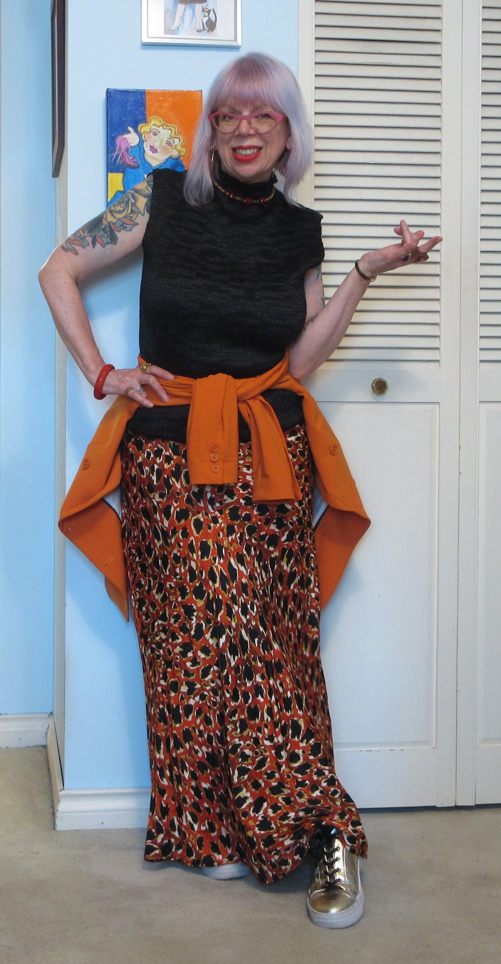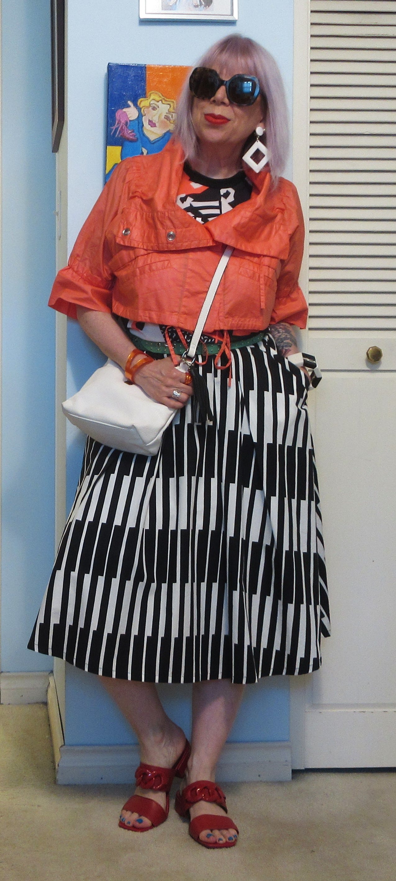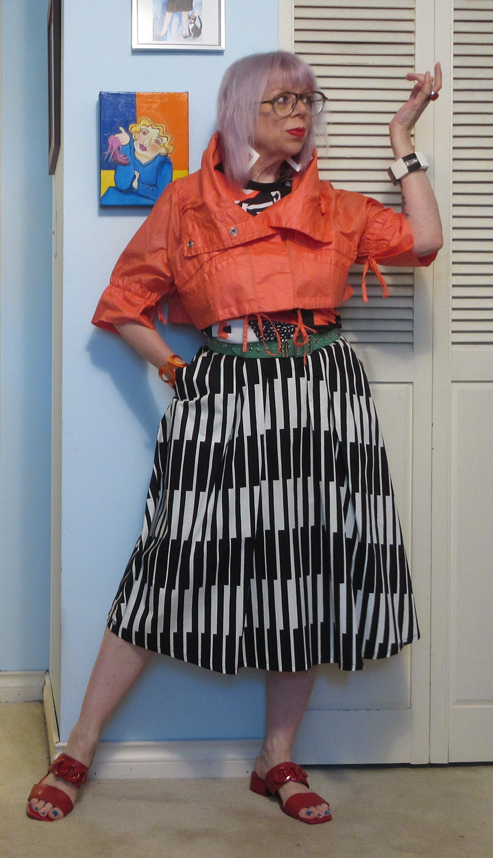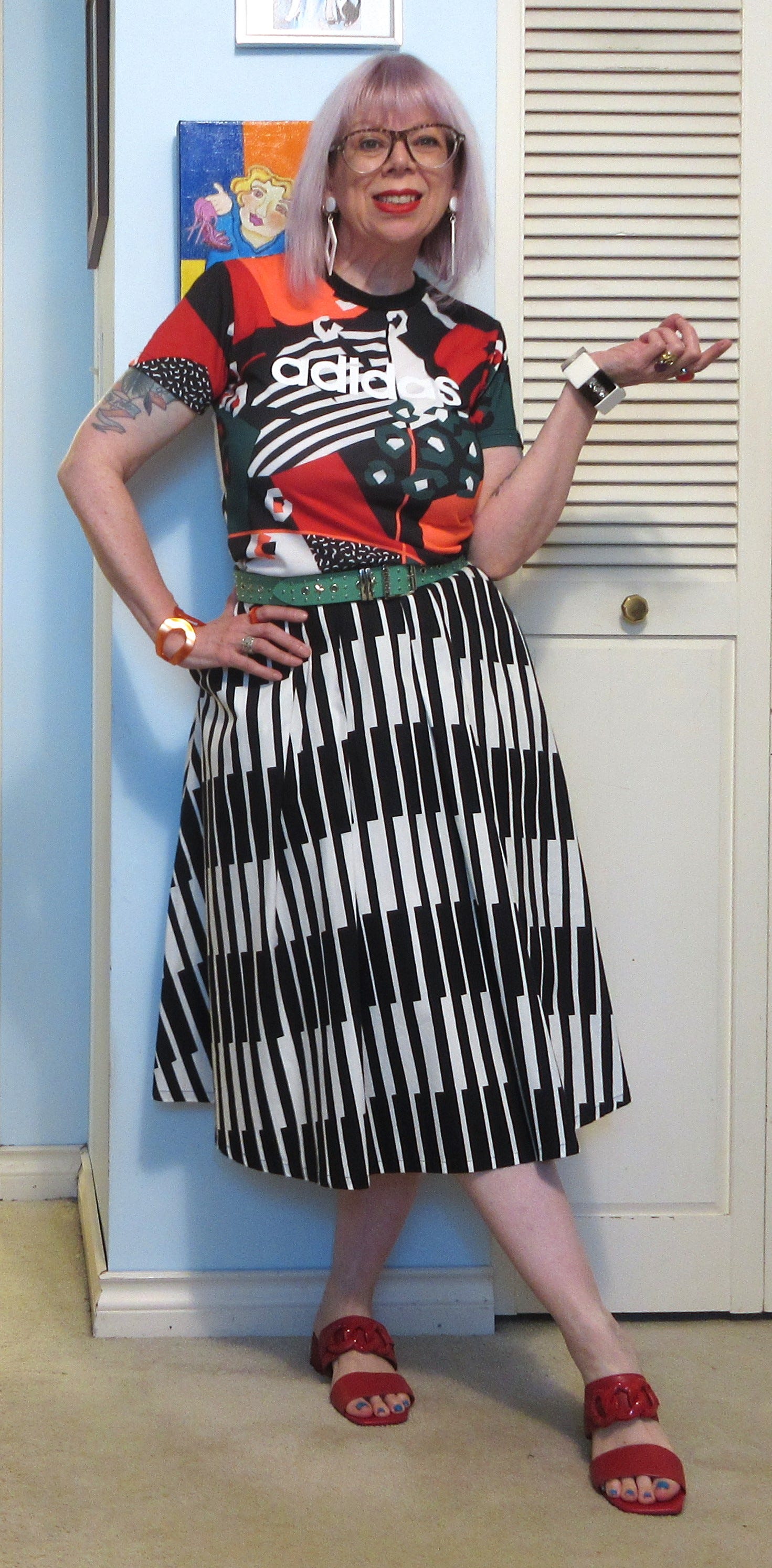 I added my recently thrifted leather belt over the striped waistband of the skirt, letting it hang down to give me a little swagger, the way I wore my Big Belt when we used to go dancing at Club California back in ‘863. Woo!