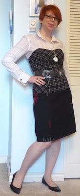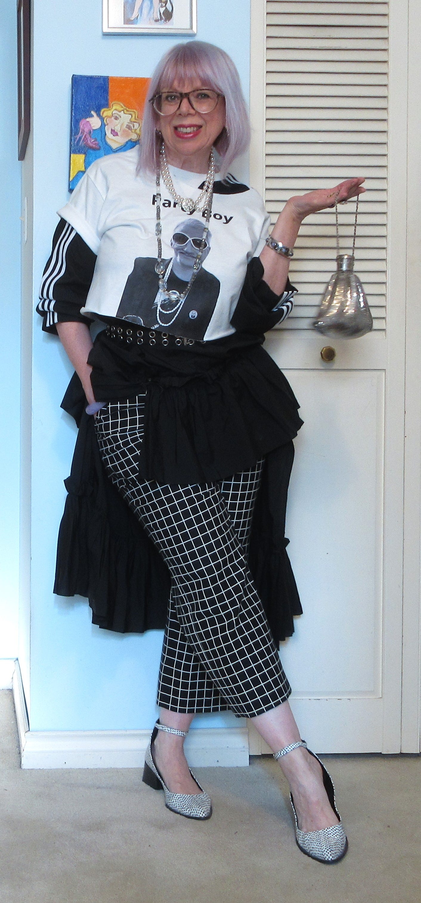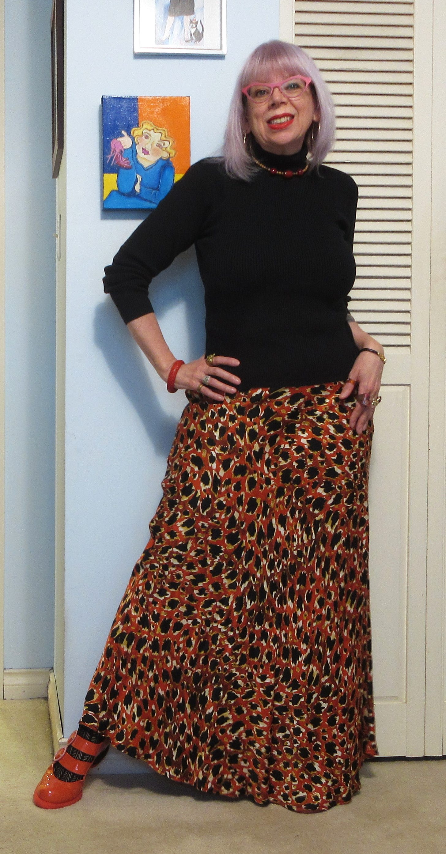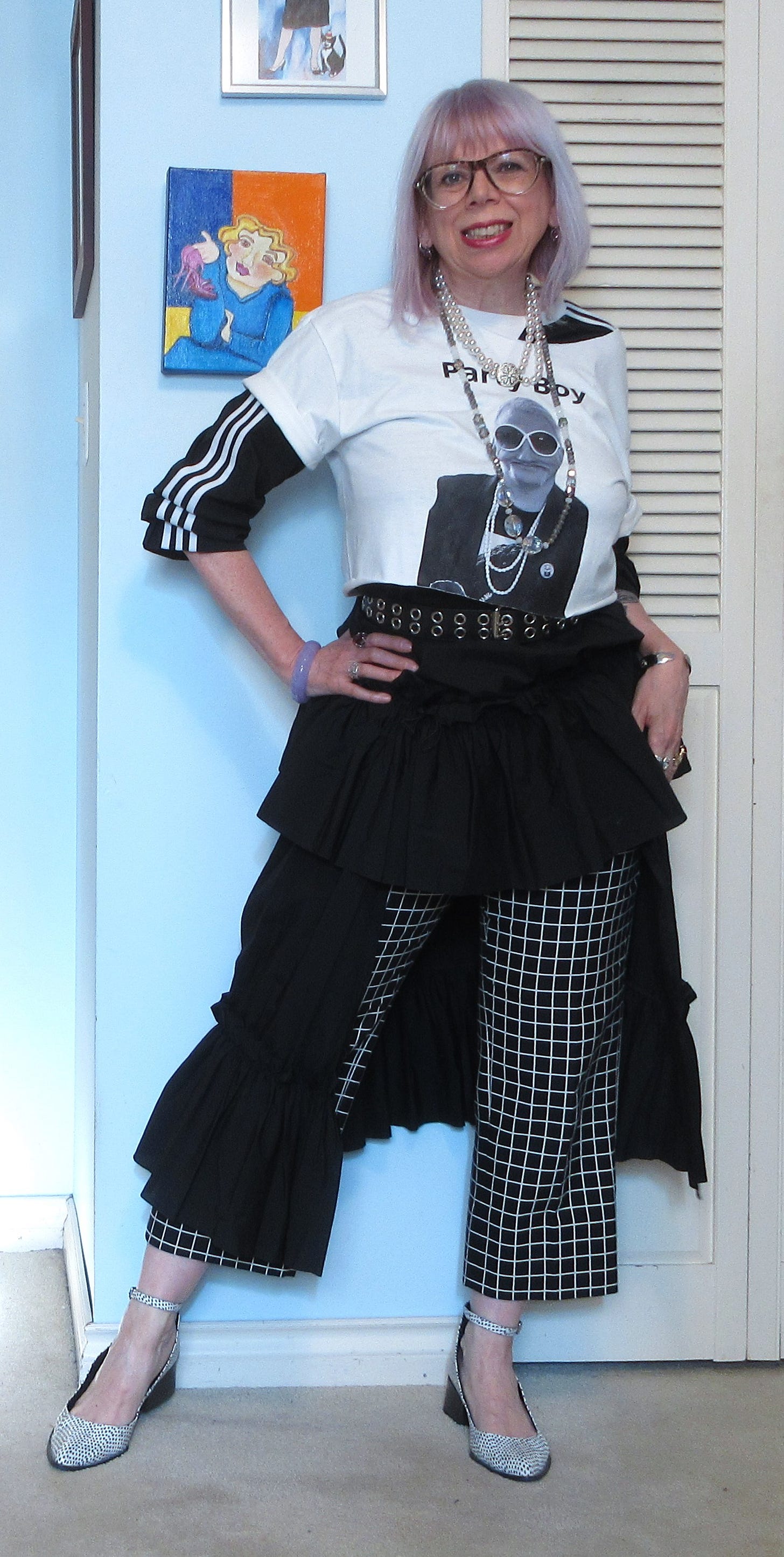 I added my recently thrifted leather belt over the striped waistband of the skirt, letting it hang down to give me a little swagger, the way I wore my Big Belt when we used to go dancing at Club California back in ‘863. Woo!