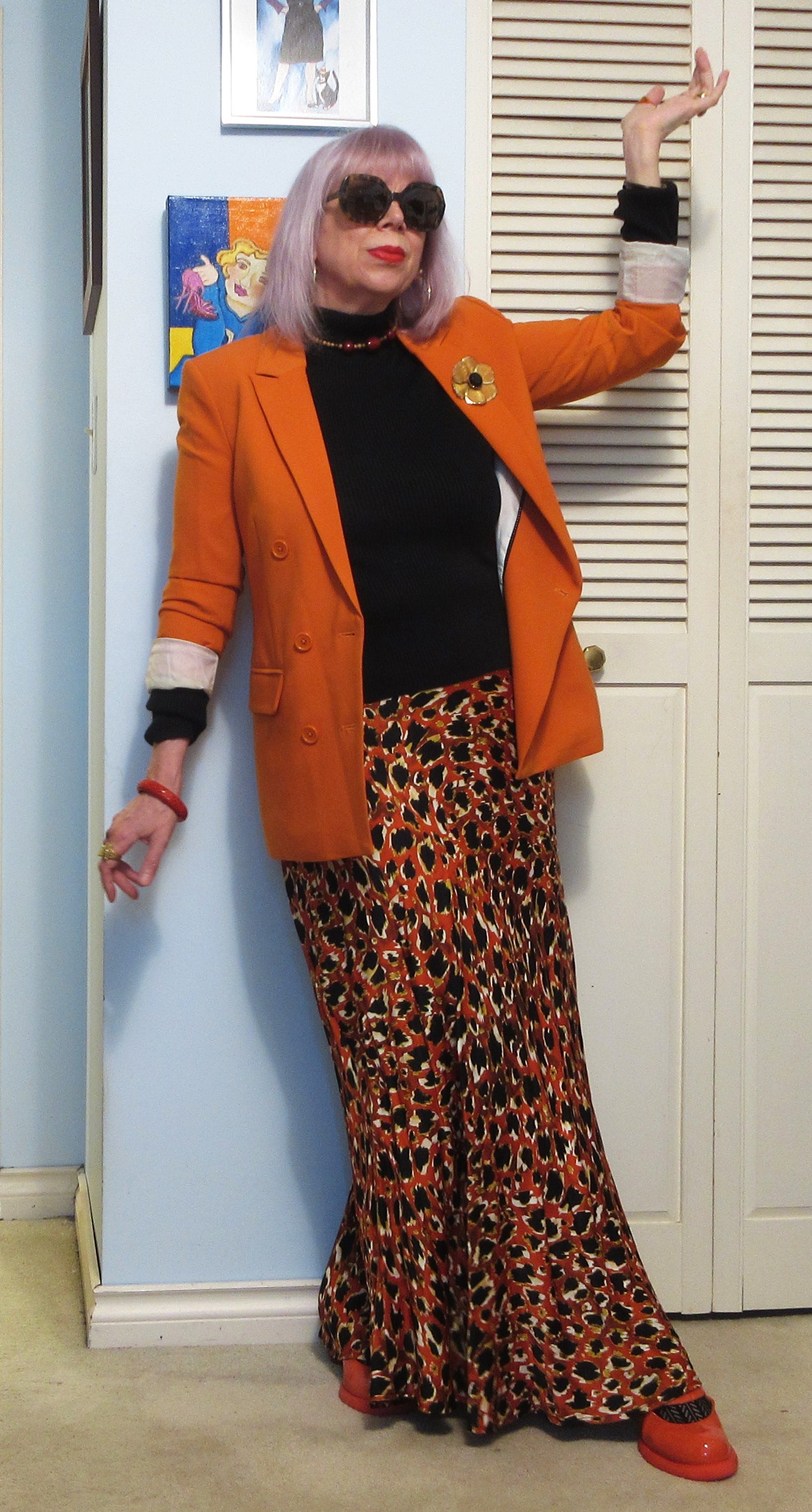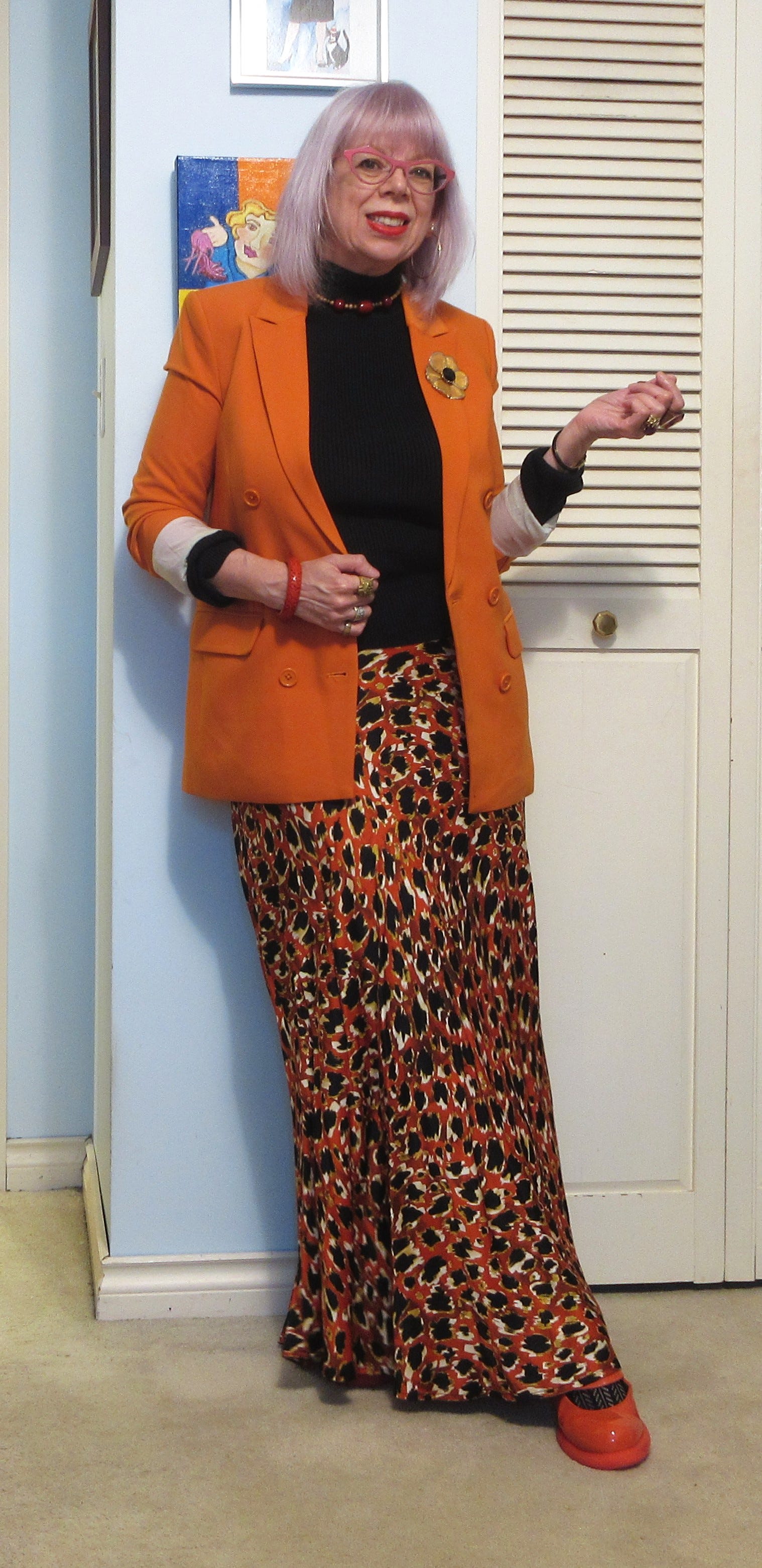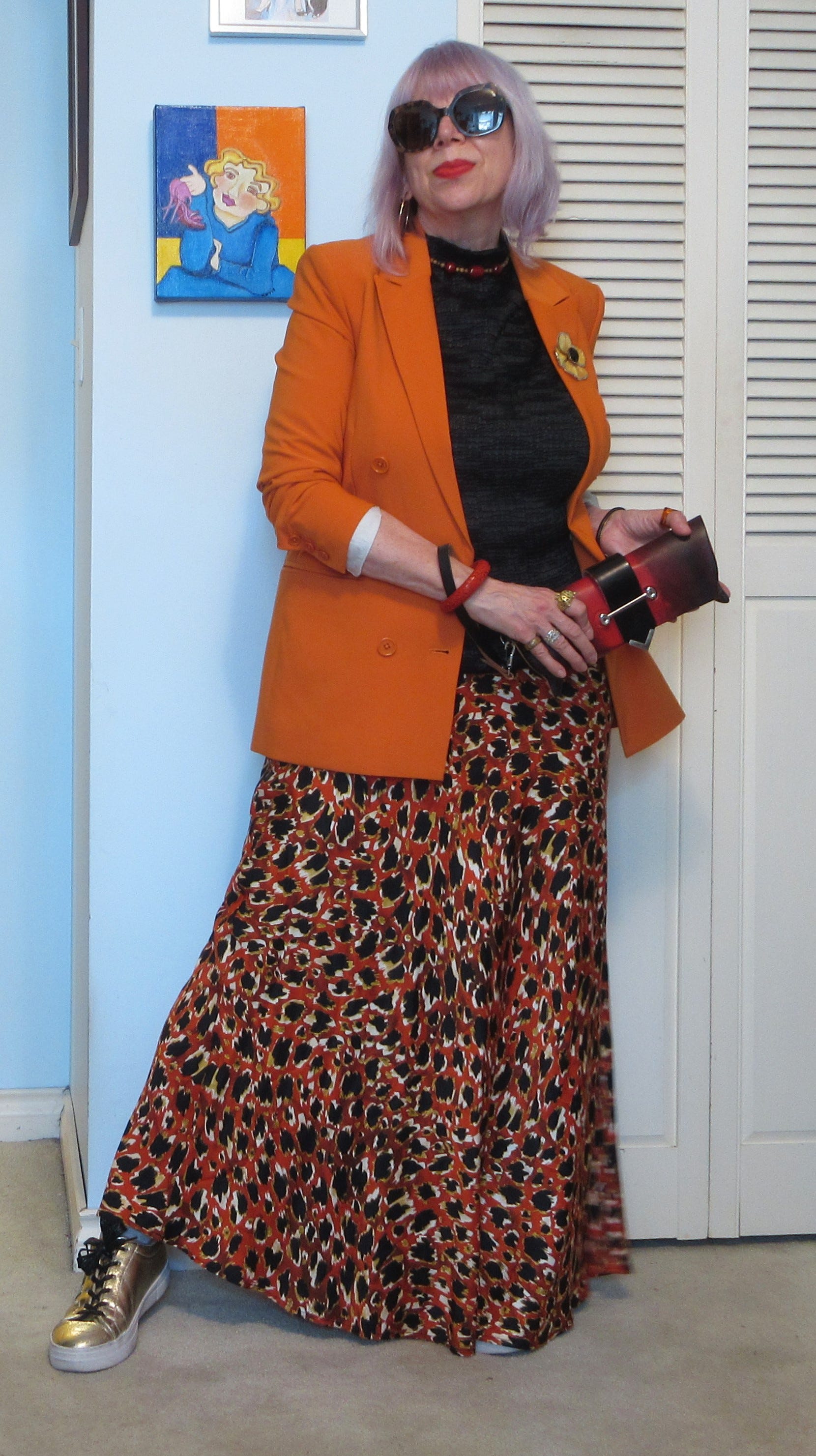 But I needed pockets, so I had to wear a blazer - I carry a thin black leather backpack during the day but I still want easy access to my phone, my bus pass…This orange blazer has been with me for over 5 years. I know it looks good with everything! A tried-and-true staple.