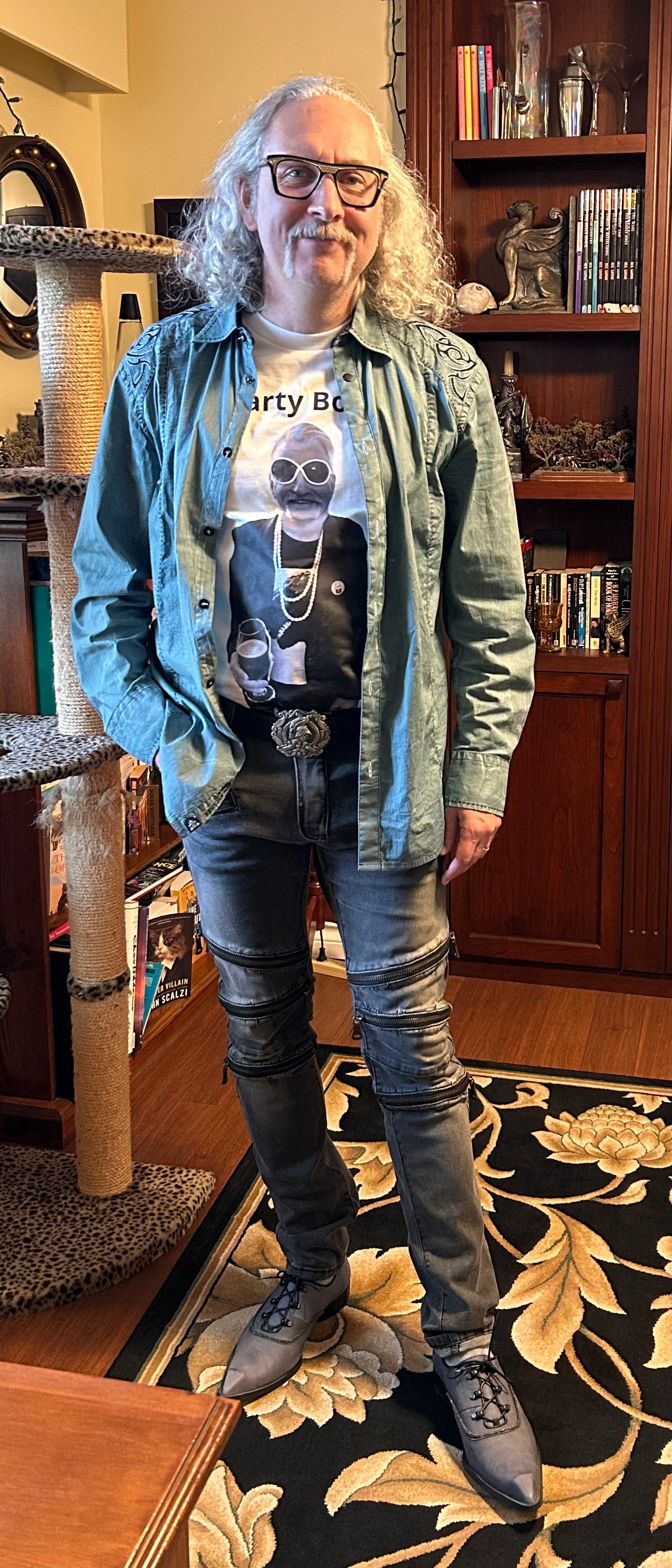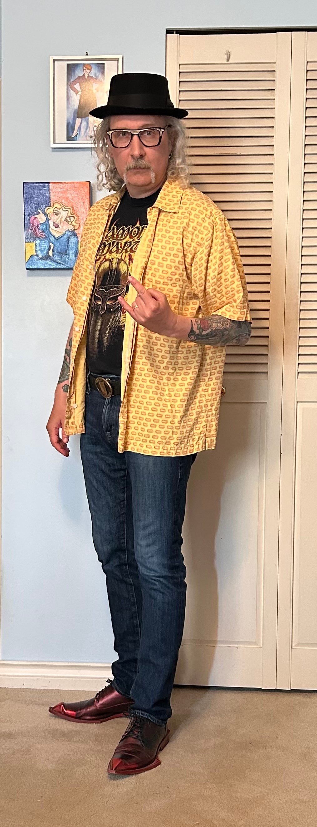 The shirt is a Y2K one bought in Vancouver. Another pair of pointy Fluevog shoes (he has many, many pairs).