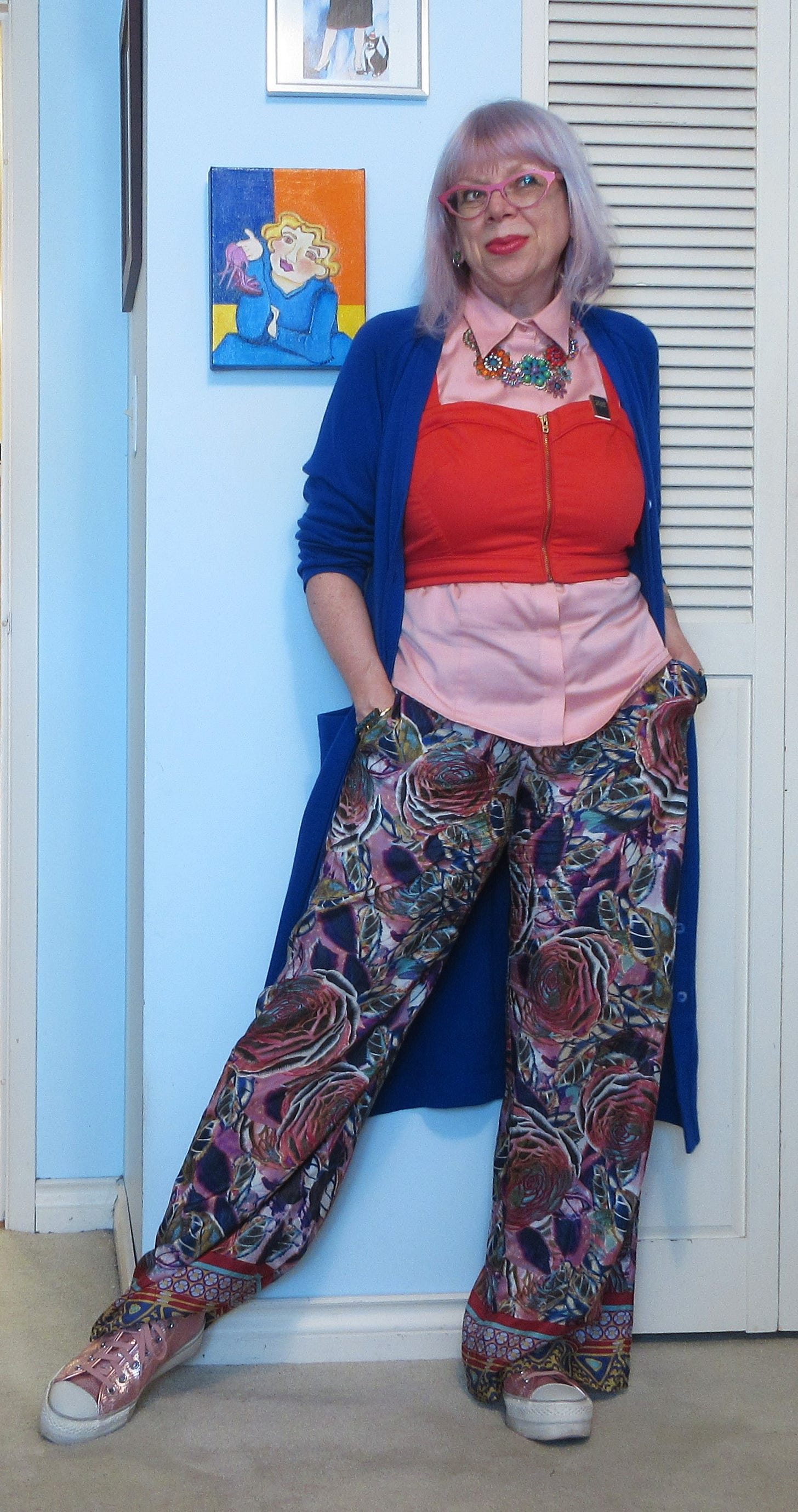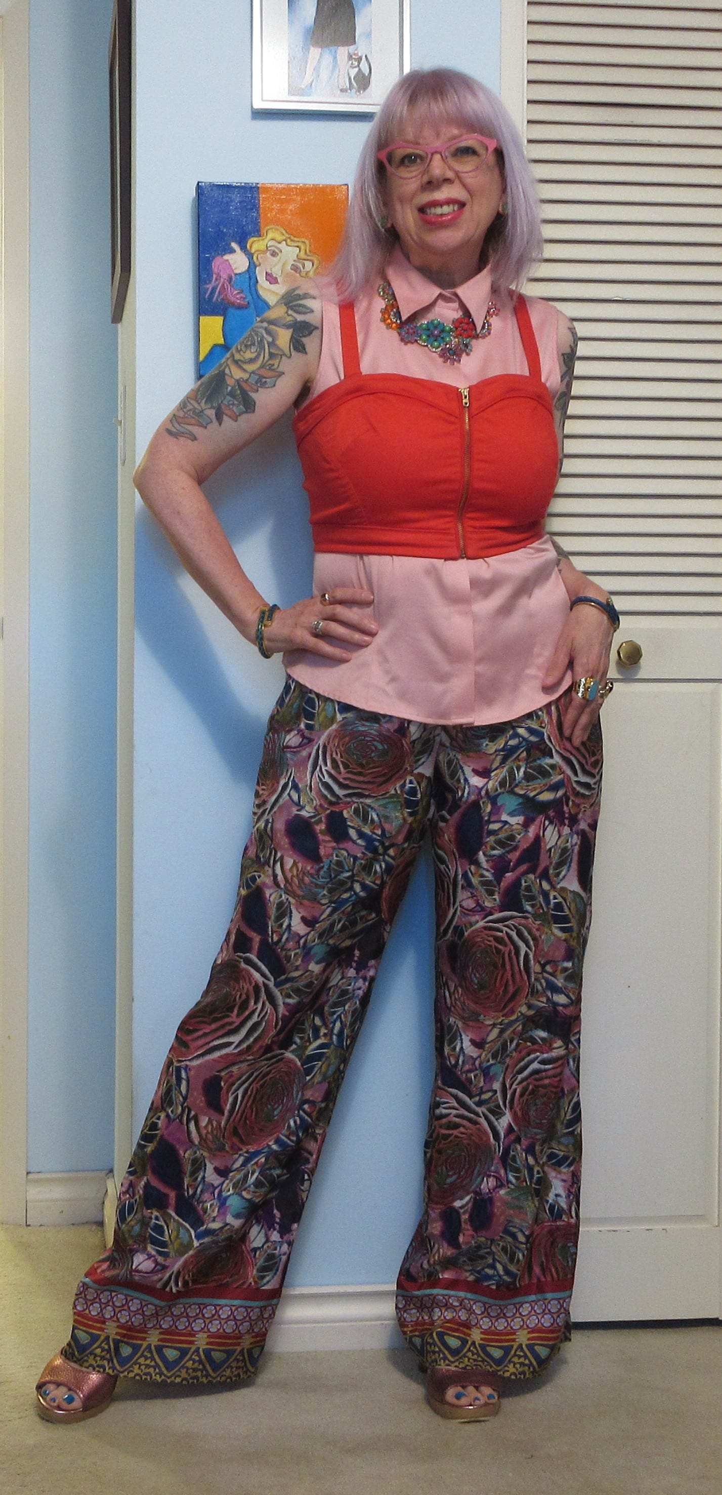 This outfit is the result of a play session in my closet - I combined absolute workhorse favourites with the wild-card piece, the red cotton bustier. The sleeveless pink top is shockingly versatile (I have easily worn it 30 times in 4+ years), and I’ve had the silk pants for years - that’s the most matching-friendly pattern ever.
