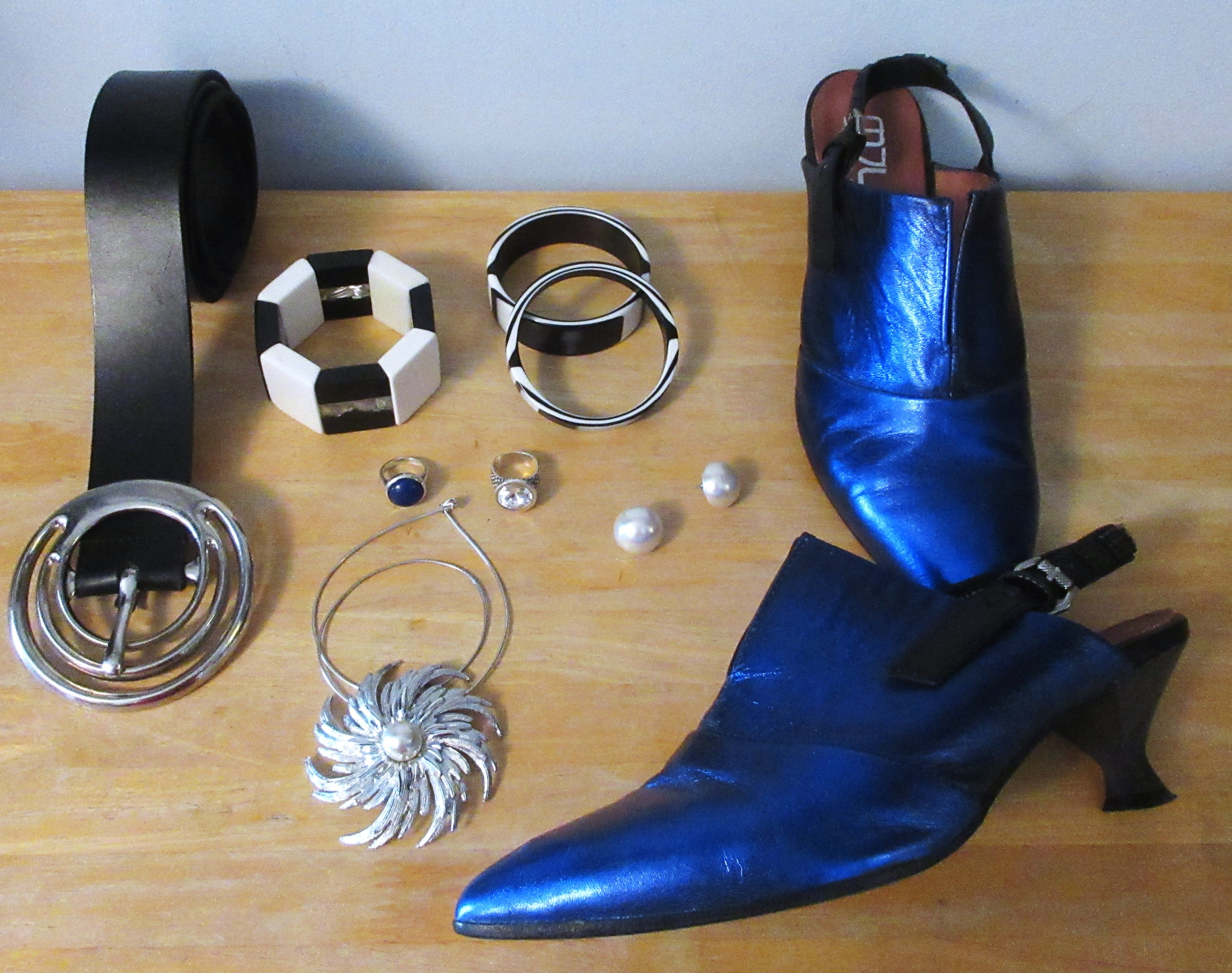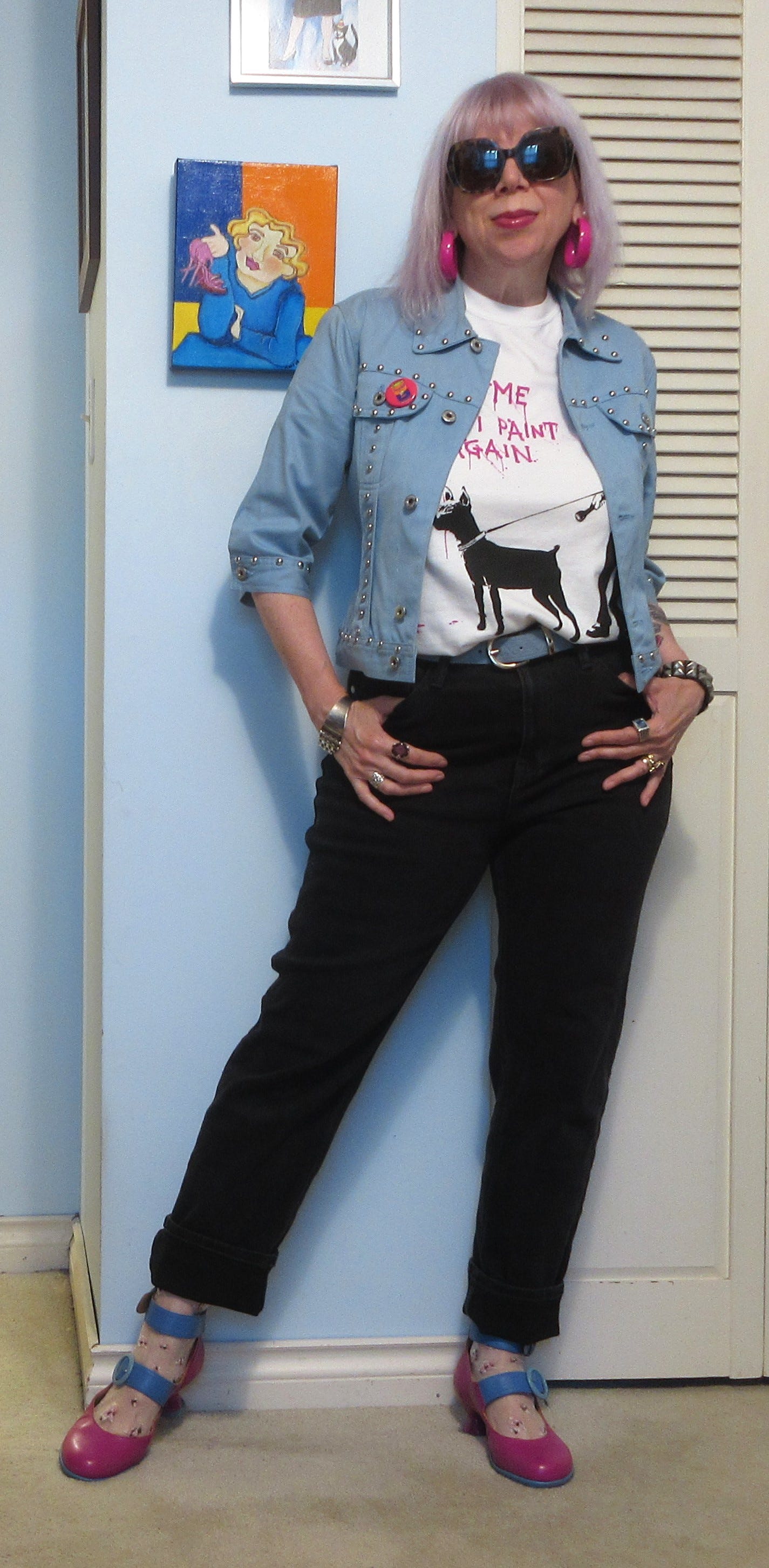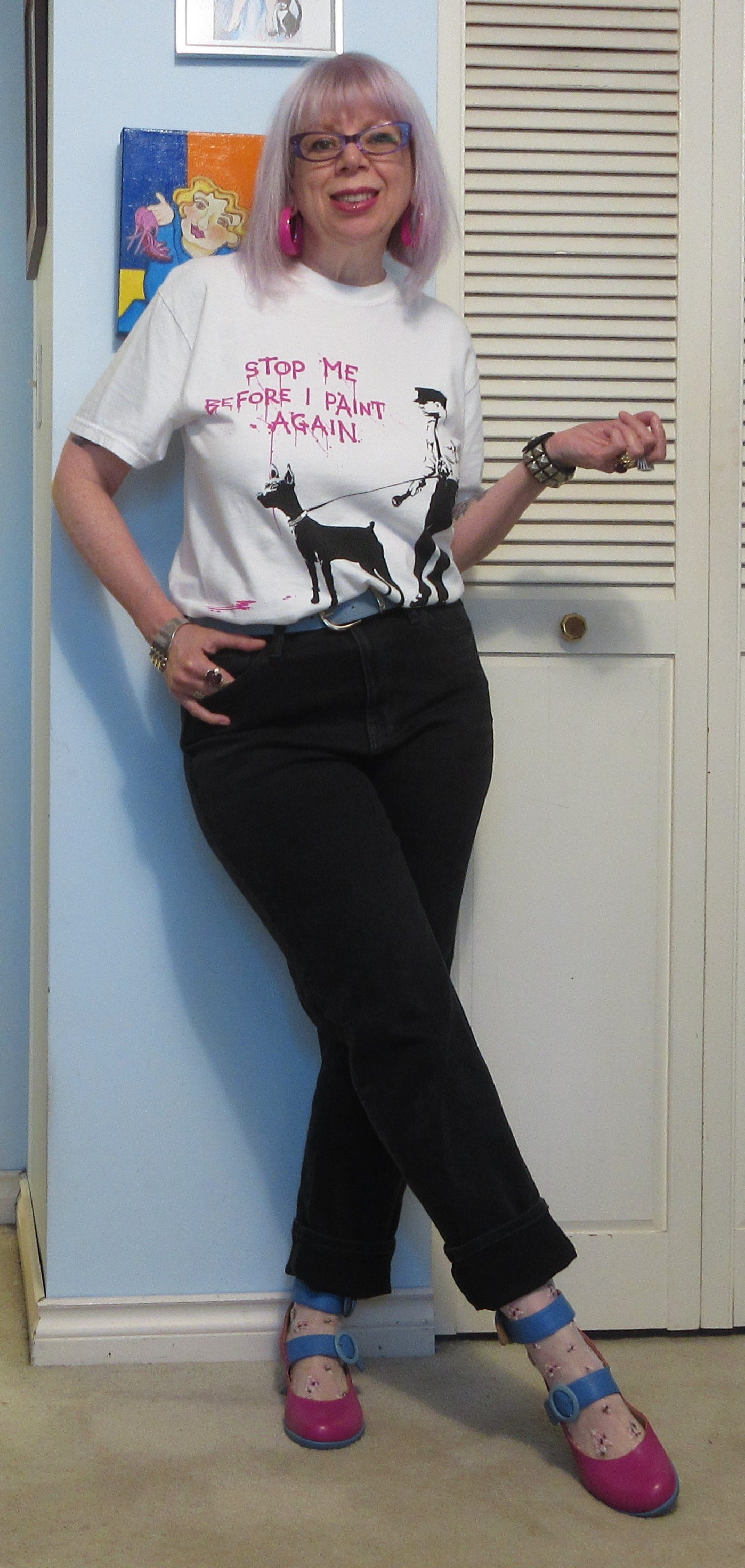 As you might have guessed, it was all about matching my earrings and shoes to the tee. I bought these Fluevogs on a final clearance sale many years ago, and the fuchsia pink and Wedgewood blue are such specific shades that they don’t get worn much. Even in my big collection, I have only a few things that go with them.