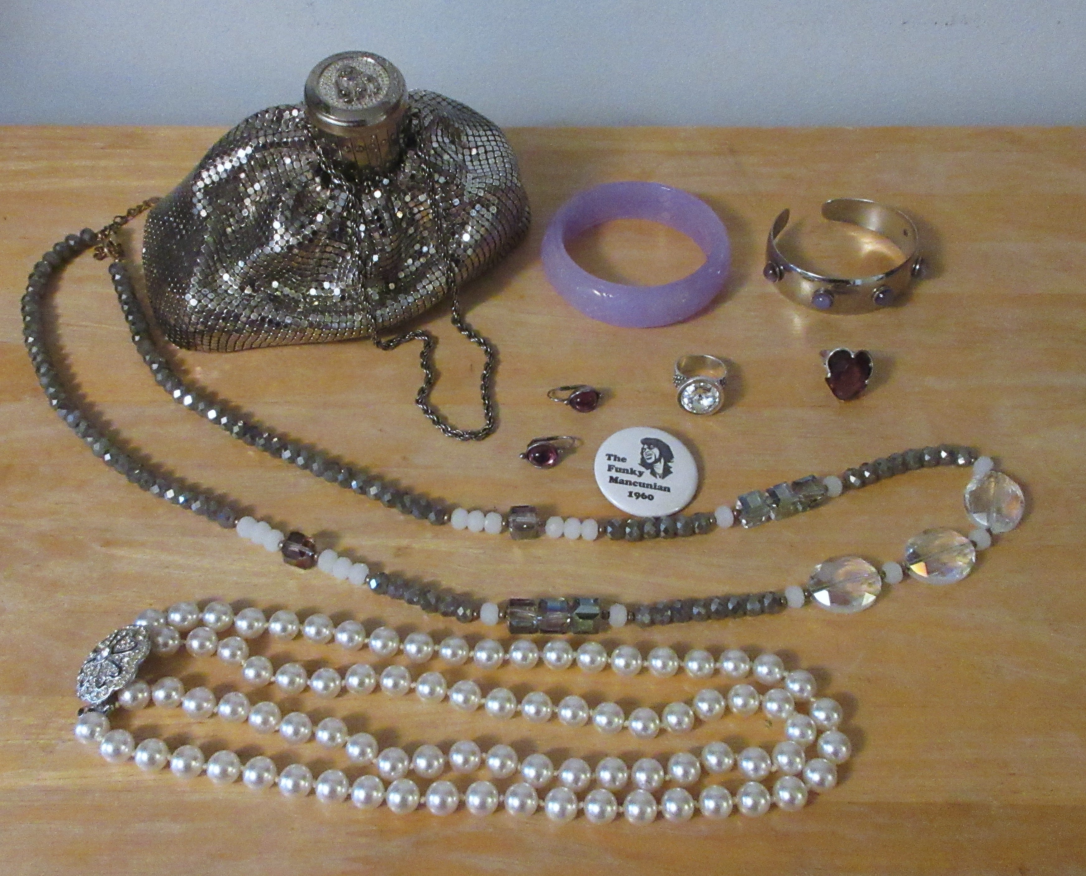 A selection of other fun things. I don’t wear my Grandma J’s double pearls (not real) very often, but they echoed the Party Boy Nick image on the tee.