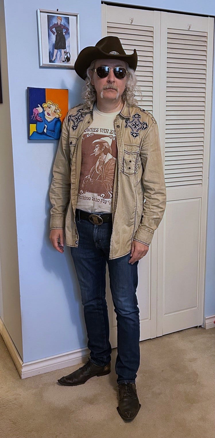 The Townes Van Zandt tee is for Logan. He had a quote from “To Live is to Fly” in his email sign-off for years and this fits his style vibe. This is a modern take on a vintage look, likely produced for an Etsty shop. There were no Townes Van Zandt merch tables back in the 70s when he was most successful, so don’t be fooled.