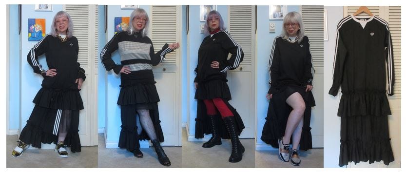 Since the dress is such an unusual item and not super visible with all this other stuff *waves hands*, I thought you might like to look at the previous ways I’ve worn it. This dress is one of the foundation garments in my Weird Adidas collection. Why have a sweatshirt when you can have a dress with “leg curtains”??